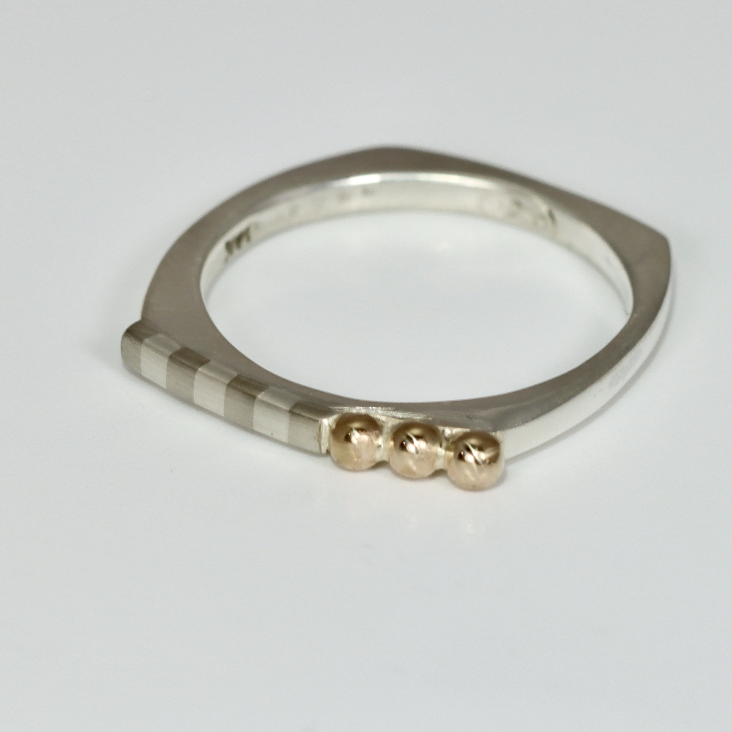 Narrow Square Ring with Stripes and three 14k gold balls.