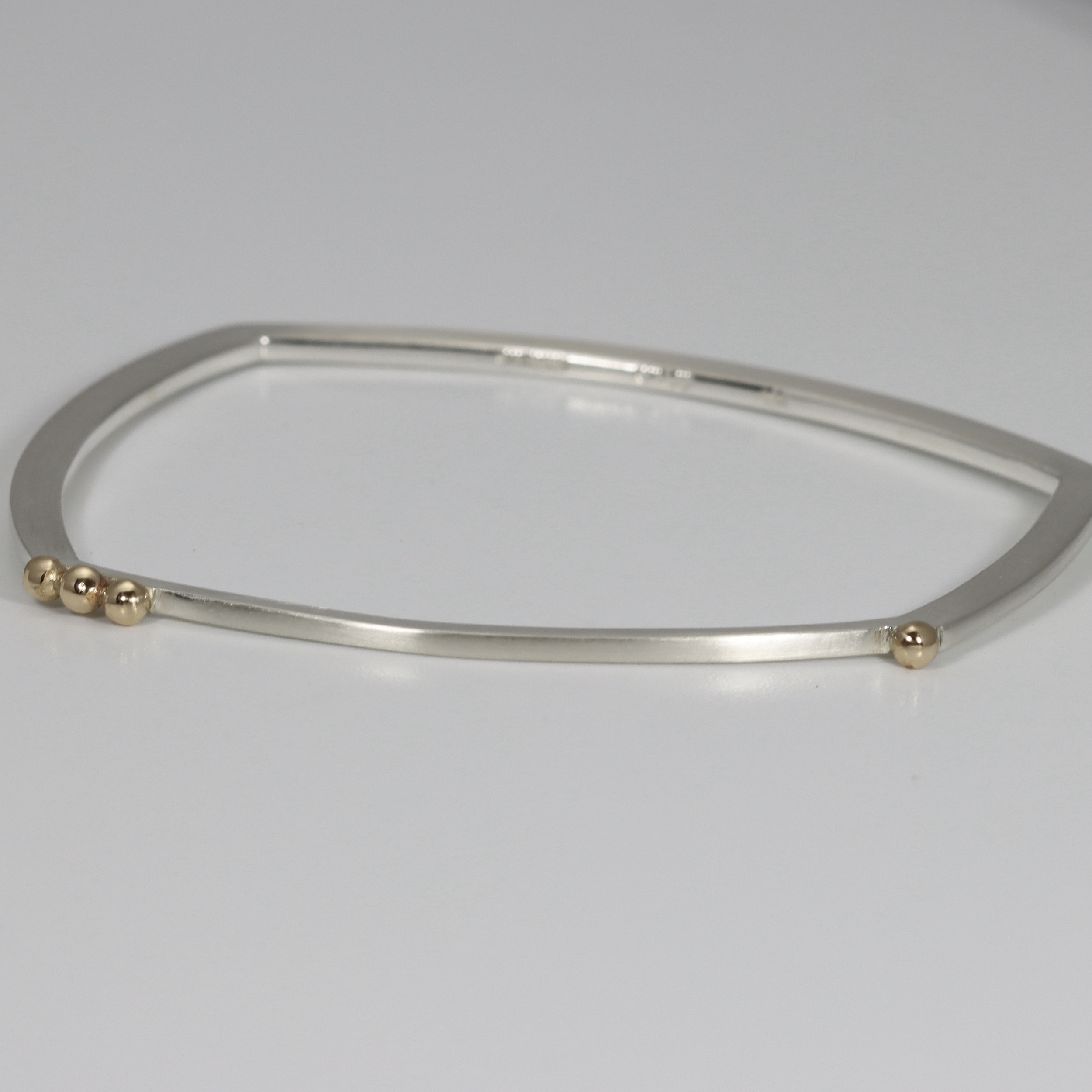 Trapezoid bangle with solid 14k balls. Hand-fabricated in sterling silver and 14k.