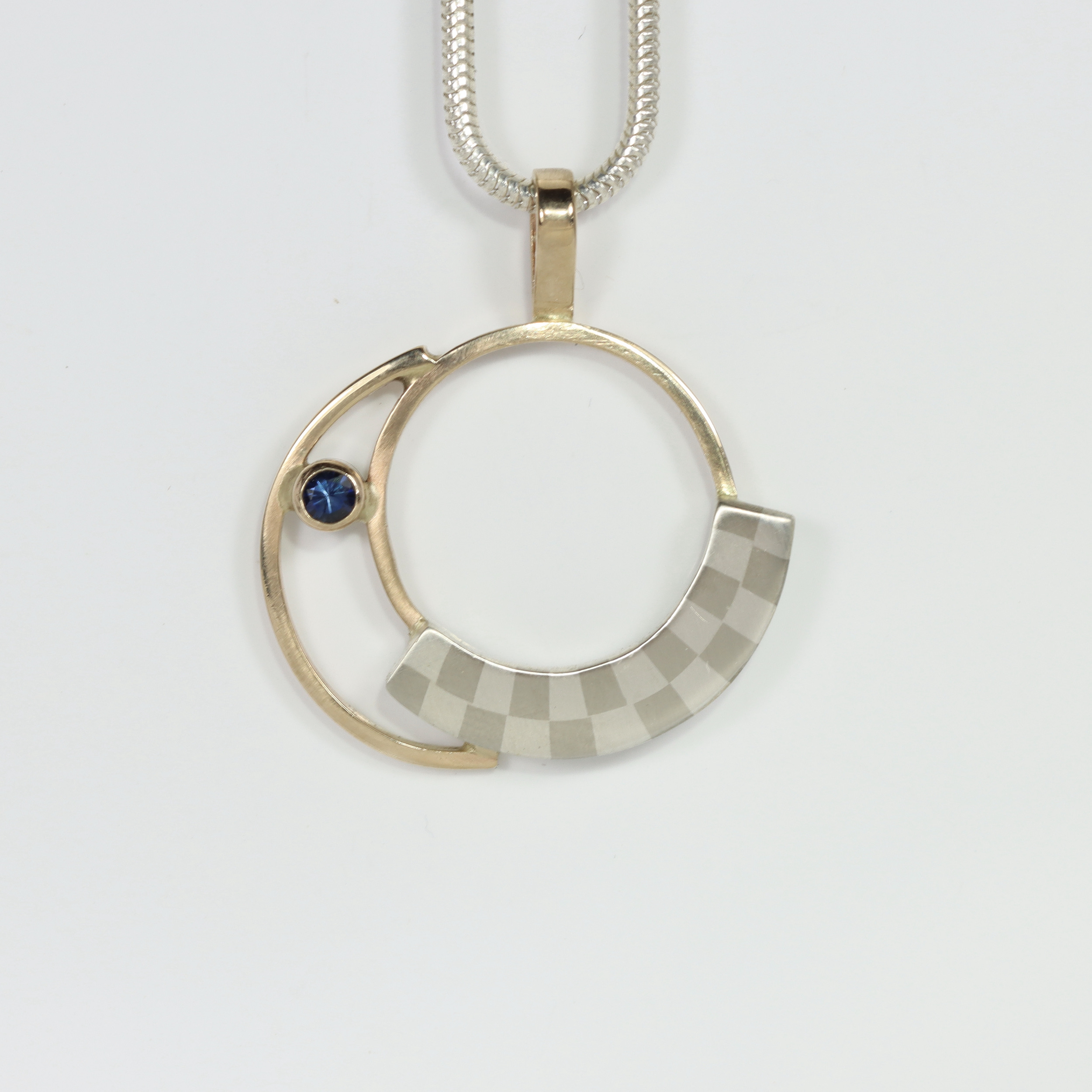 A circular pendant with a sapphire. Hand-fabricated in sterling silver and 14k gold. A subtle checkerboard pattern contrast lovely with the 14k yellow gold and blue sapphire.