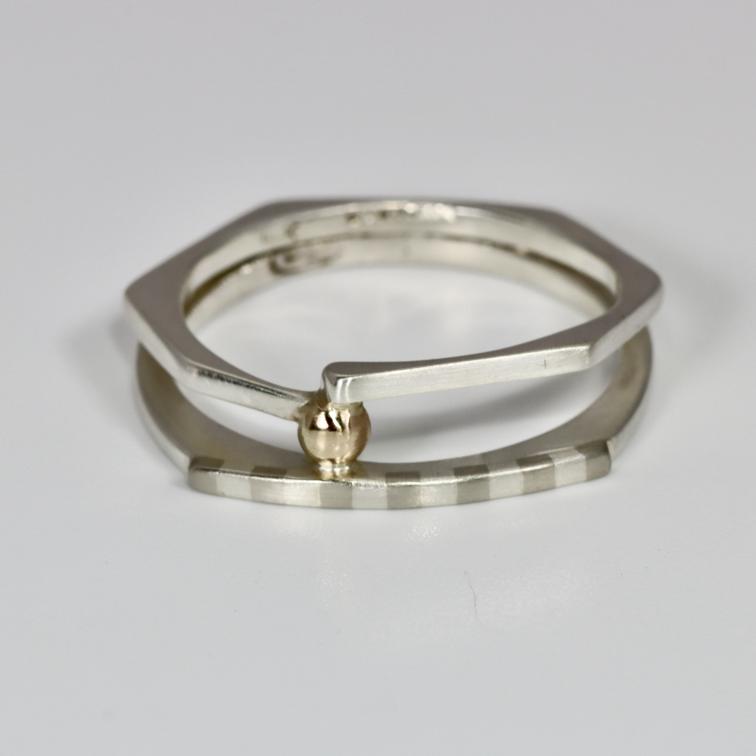 The ring is fabricated in sterling silver and 14k.