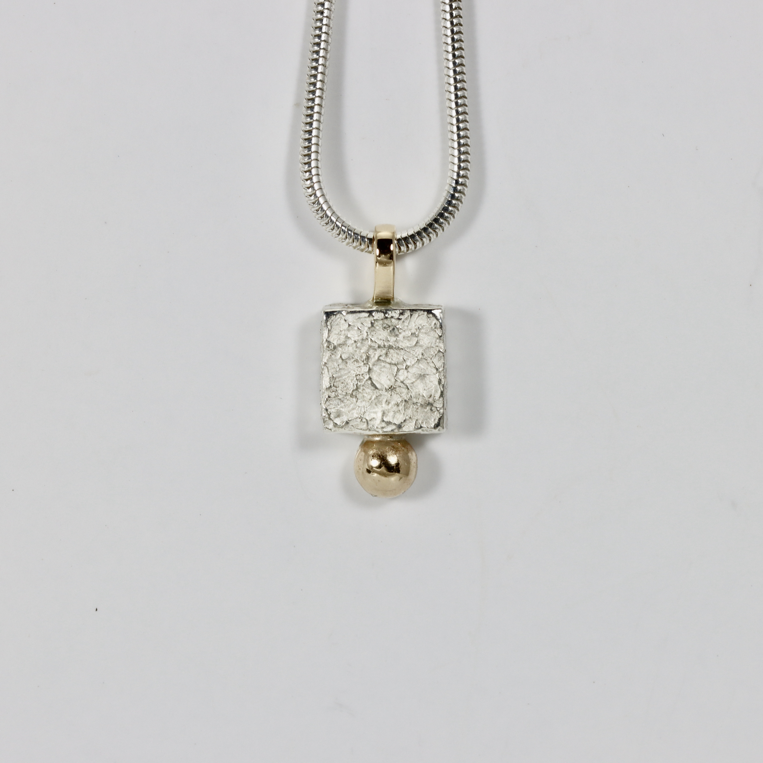 Sterling textured square Pendant with a 14k gold bail and ball at the bottom of the pendant.